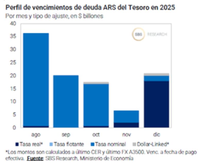 "Si bien la carga de vencimientos de corto plazo subió en el margen, sigue en niveles manejables. Los vencimientos de deuda en pesos entre agosto y diciembre de 2025 equivalen al 13,2% del PBI. Al considerar los vencimientos con plazo residual igual o menor a 5 meses, se trata de la mayor concentración desde abril de 2024; cuando los vencimientos entre mayo y septiembre de ese año ascendían a 14,0% del PBI", dijeron.