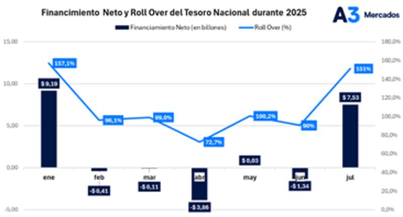 En julio, y gracias a la licitación fuera de calendario, el rollover fue del 151%. En lo que va del año promedia el 100%, salvo enero y el mes pasado que superaron el 100%, según dato de A3 Mercados.