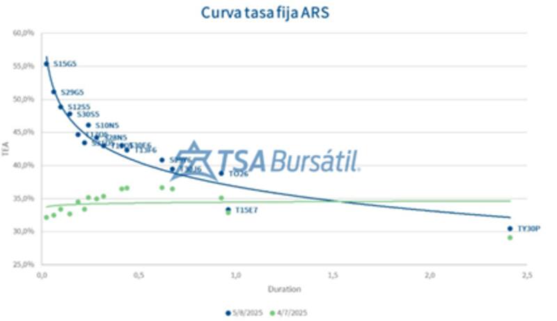 Actualmente la curva a tasa fija opera con tasas de 55% (TNA), cayendo a niveles de 45% en el tramo mas corto y en valores de 30% a 40% en los tramos mas largos.