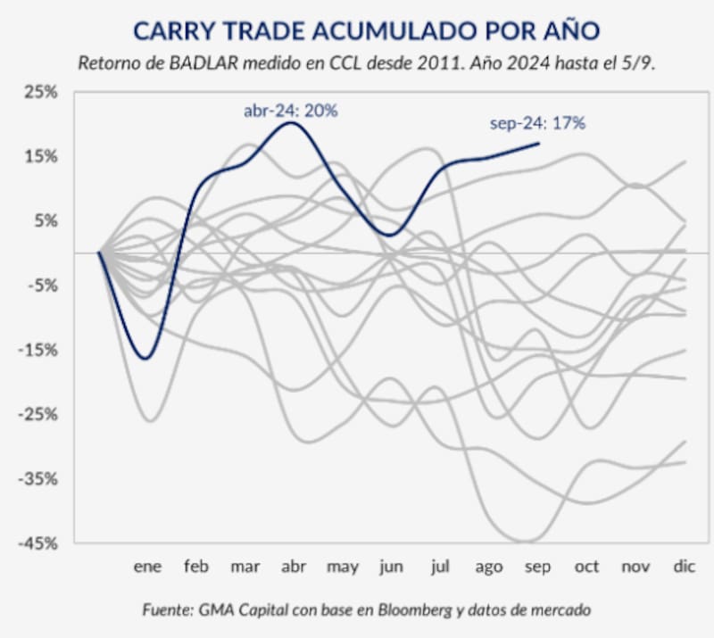 Nery Persichini, head de estrategia de GMA Capital, agregó que las elevadas tasas nominales en pesos de nuestro mercado (que compiten contra una inflación en descenso, pero aún de magnitud) han llevado a un nuevo período exitoso de carry trade.