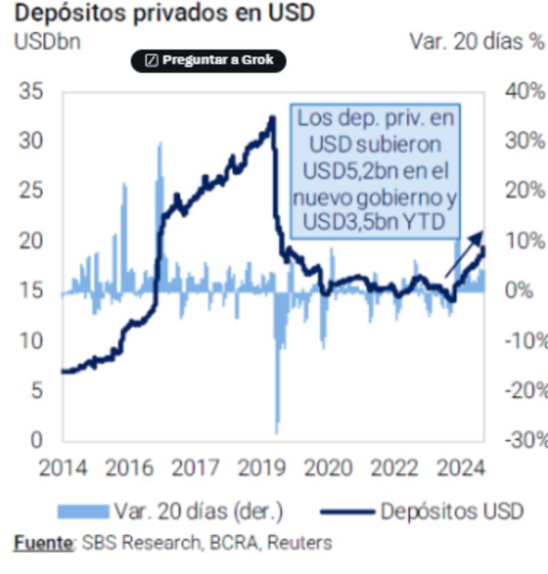 Aunque también alertaron desde Grupo SBS que "estas posiciones tienen sus riesgos ante movimientos bruscos en el CCL y que la posición de reservas es negativa, con factores que podrían presionar hacia adelante"