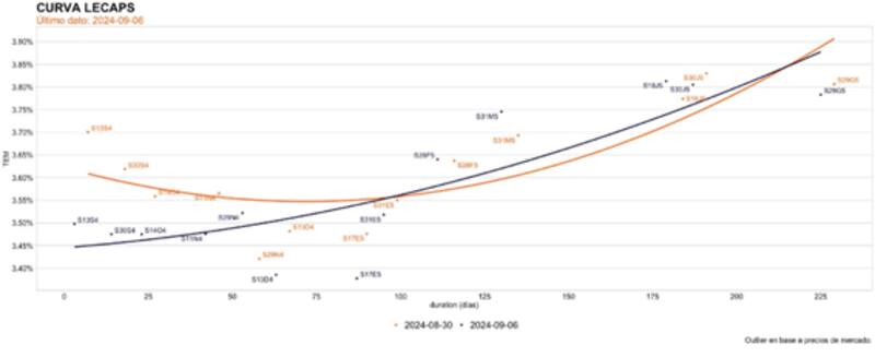 Actualmente, el tramo corto de la curva de Lecap opera con tasas de entre 3,4% y 3,5%, mientras que el tramo más largo rinde entre 3,7% y 3,8% (TEM)