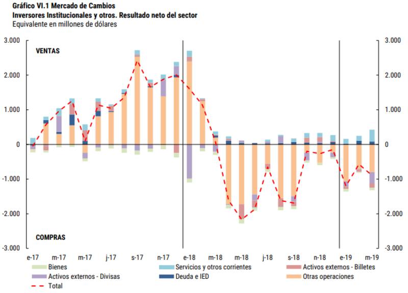 El rubro que más peso tuvo en ese movimiento fue la "compra-venta de títulos valores" que arrojó una salida neta de u$s 680 millones en marzo a lo que se le sumaron compras netas de billetes por u$s 120 millones.