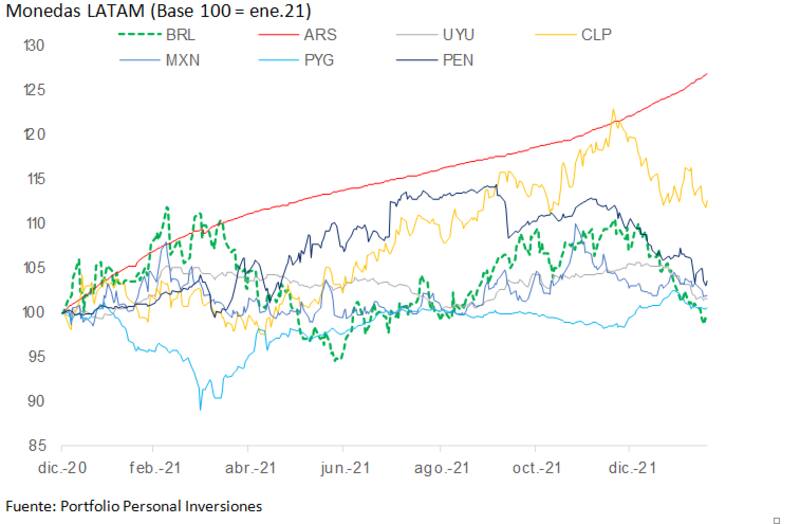 "El homólogo al REM en Brasil indica que el banco central del país vecino endurecería aún más su política monetaria durante 2022, lo cual apreciaría el tipo de cambio real brasileño. Ergo, el peso argentino se deprecia contra el real. Esto, junto con la reciente recuperación de los precios de los productos agropecuarios, lo que los modelos asocian generalmente a un tipo de cambio real más apreciado, naturalmente le quitan presiones al BCRA en el corto plazo", comentó.
