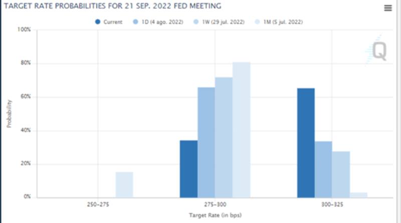 De esta manera, las probabilidades de ver una suba de 75 puntos básicos en la próxima reunión de septiembre saltaron por encima del 60% y las chances de ver un hike de 50 puntos básicos cayeron debajo de 40%.
