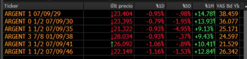 Finalmente, los extremos más largos de la curva también caen, con los bonos perdiendo 1,06% y 1,16% en los Globales 2041 y 2046.