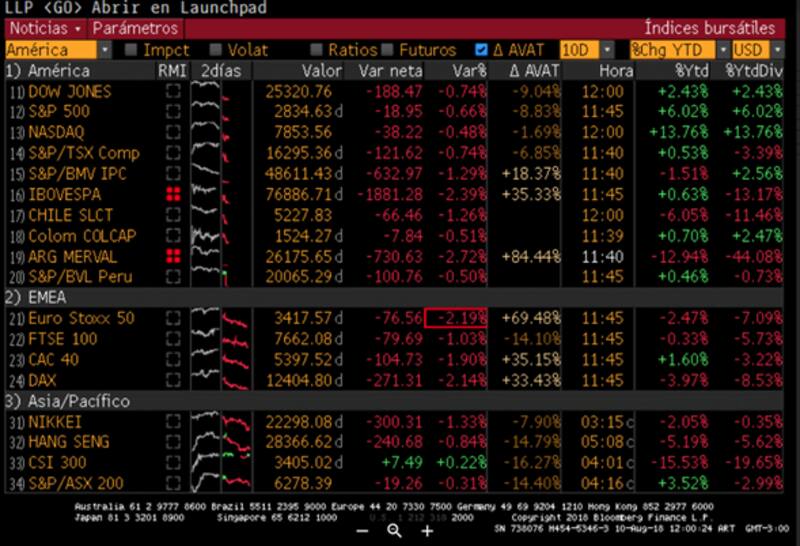 Por su parte, las bolsas europeas también se contagian del pesimismo con bajas de hasta 2,2% y en la región, tanto el Merval, el Ibovespa y el IPC de México operan a la baja con pérdidas del 2% en promedio. Justamente, el Merval es el que más pierde con descensos de 2,72% en el día de hoy.