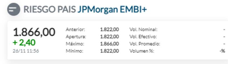 El indicador que mide JP Morgan se ubica en 1886 puntos básicos, y de esta manera avanza 800 puntos (73%) desde el canje de deuda llevado a cabo con acreedores externos en septiembre de 2020, cuando el Gobierno reestructuró u$s 65.000 millones con acreedores privados