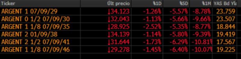 Todos los bonos argentinos abren a la baja el viernes. La parte mas corta de la curva cae 1,26% en el Global 2029 y 1,1% en el Global 2030. Por su parte, en el Global 2035 retrocede 2,5% mientras que el Global 2038 pierde 1,1%.