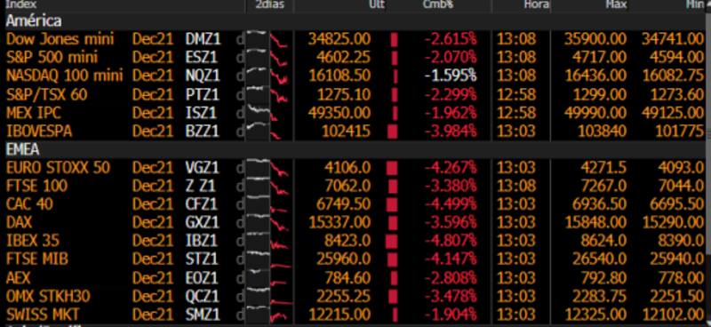 Las bolsas a nivel mundial viven un viernes negro. Una nueva variante de coronavirus genera temor en los mercados que operan en la última jornada de la semana con una fuerte presión bajista.
