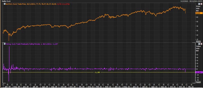 El petróleo WTI opera con una cada de 11,5% y de esta manera es la mayor pérdida diaria desde abril de 2020, cuando en aquel momento llegó a perder mas del 14% en un solo día.