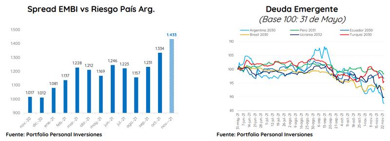 "Vamos de a poco entrando a un mundo de tasas más altas y el universo de deuda emergente se ve perjudicado. Los países con desequilibrios en lo monetario y dificultades en las balanzas de pagos son los que peor caen parados. No sorprende que Argentina, dentro de este grupo, sea el mas perjudicado. Lejos quedó el rally en los precios pre PASO con títulos que aun con el escenario electoral definido no levantan cabeza y se ubican hoy en niveles mínimos. La consecuencia la vemos con un riesgo país en máximos post restructuración y un spread con respecto a LATAM ampliándose por encima de los 1.430 puntos", dijeron.