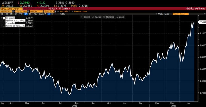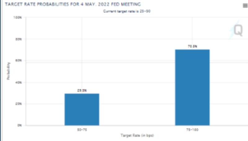 De hecho, los inversos especulan con que la Reserva Federal (Fed) se va a tornar más agresiva ante la suba de tasas en las próximas reuniones. La probabilidad de ver un hike (suba) de 50 puntos básicos en la reunión de mayo se dispara al 70%.
