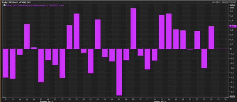 Sin embargo,la volatilidad en el mercado se mantiene por encima de los mínimos de febrero y las acciones han oscilado esta semana debido a que la guerra en Ucrania generó preocupaciones sobre la inflación y las interrupciones en el suministro de materias primas en medio de datos económicos mixtos.