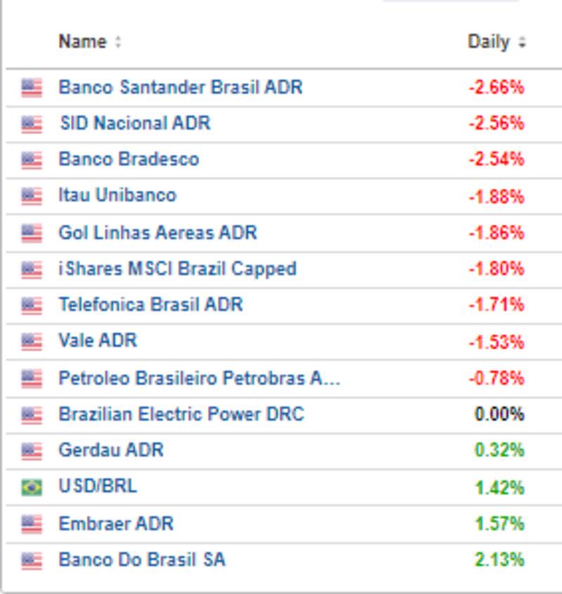 En paralelo, las acciones de Brasil inician la semana a la baja, con pérdidas de 1,8% para el índice accionario brasilero en dólares (EWZ).