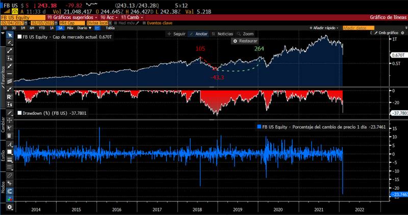Maximiliano Donzelli, Jefe de Research de IOL invertironline remarcó que las acciones de Meta Platforms (NASDAQ: FB) se desploman un 26% en la sesión bursátil de este jueves luego de que la compañía haya anunciado sus resultados trimestrales, provocando así la mayor caída histórica de la cotización.