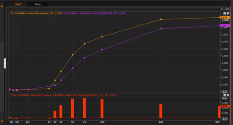 Todos los tramos de la curva soberana de EE.UU. se están desplazando al alza. El tramo corto, con los bonos a dos años, muestra un fuerte desplazamiento alcista en la última semana y operan en niveles de 0,3%, el valor más alto desde marzo de 2020.