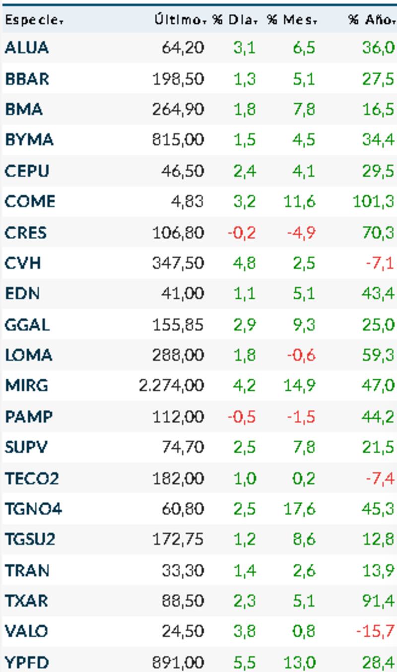 La suba más importante la ostentó YPF, que saltó 5,5% y en lo que va del año lleva un alza de 28,4% en pesos. Parte de ello se debe a que en los poco que tanscurrió del mes, la petrolera lleva un avance de 13 por ciento.