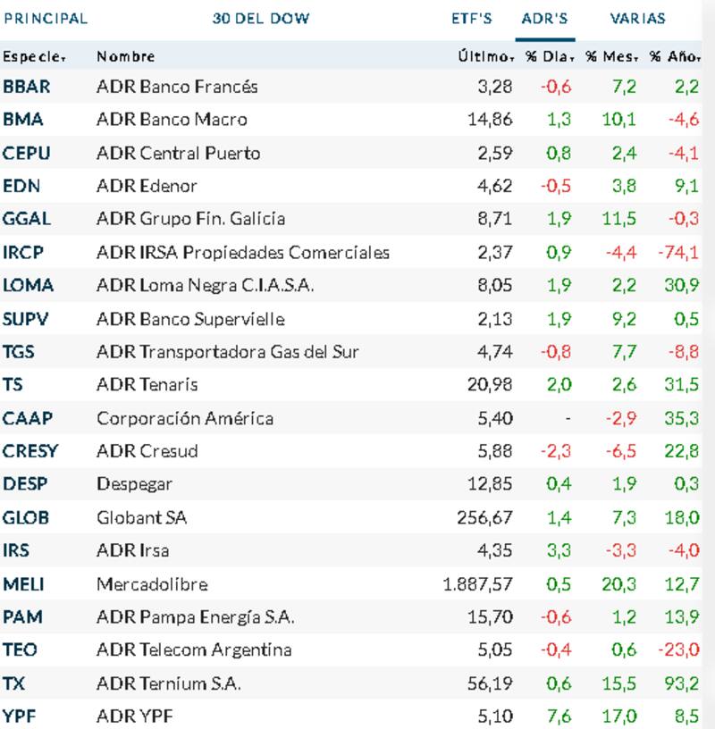 Al igual que sucedió con el Merval, la mayoría de acciones argentinas que cotizan en Wall Street tuvieron avances. El más importante de ellos lo mostró YPF, con una suba del 7,6%, seguida por Irsa, que tuvo un alza de 3,3 por ciento.