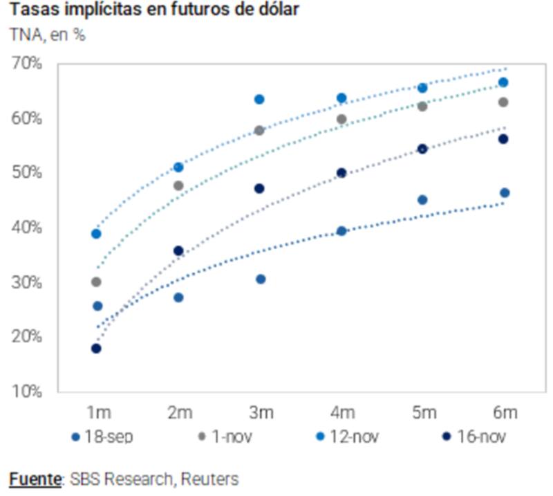 El 12 de noviembre, las tasas implícitas dentro de la curva de futuro de dólar se ubicaban en 40% a un mes, 50% a 2 meses y por encima del 60% en los plazos de entre 3 a 6 meses.
