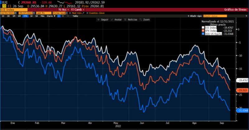 En primer lugar, el deterioro de las expectativas. Si crecen las chances de ver una recesión, las compañías ganarán menos dinero en ese escenario y por lo tanto el mercado lo pricea hoy con fuertes bajas.