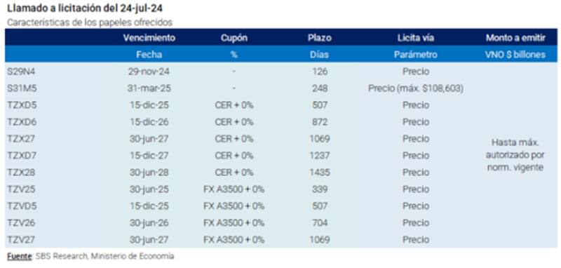 Todos los instrumentos licitarán precio con excepción de la Lecap S31M5, donde el equipo económico estableció una tasa mínima de 69,7% TEA que equivale a una TEM del 4,5%.