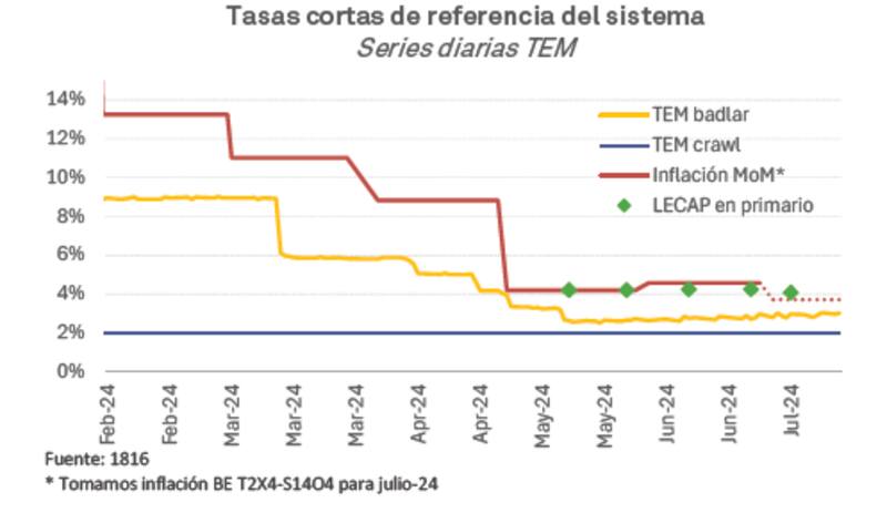 "Vemos la brecha cambiaria oscilando en una banda de entre 35% y 45%. Para esto preferimos posicionarnos en Lecap, que si bien creemos que el tramo largo puede comprimir si se consolida el sendero de desaceleración de la inflación, en el corto plazo está el riesgo de una potencial suba de tasas. Creemos conveniente estirar duration hasta octubre que rinde en torno a 4% TEM", detallaron.