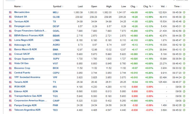 Las acciones de MercadoLibre, Globant, Ternium y Despegar son las que más suben, con avances de entre 3% y 6%.