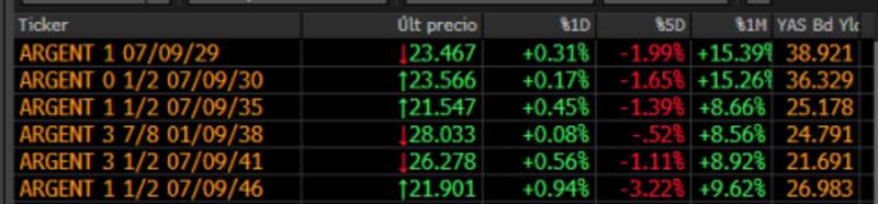 Todos los tramos de la curva abren en verde, con el Global 2029 u Global 2030 avanzando 0,3% y 0,17%.