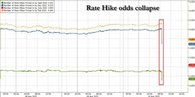 En ese sentido, colapsaron las probabilidades implícitas de suba de tasas de 75 puntos básicos para las próximas reuniones a niveles cercanos a 35% desde el 70% previo al dato de inflación de hoy.