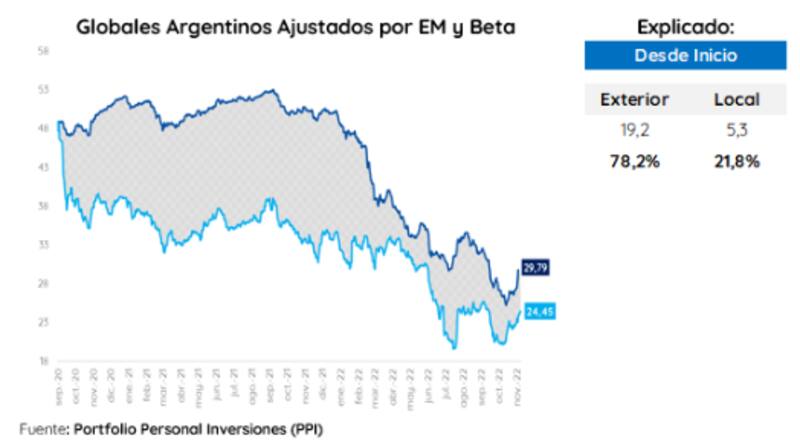"Teniendo en cuenta, nuestro índice de Globales ajustado por el índice de emergentes y el beta histórico de los bonos argentinos, observamos que el indicador marca que el precio de los bonos debería estar en u$s 29,79 (contemplando únicamente factores externos). De hecho, desde el inicio de la cotización de los títulos, la tendencia del exterior explica el 78,2% del movimiento de la deuda argentina", dijeron.