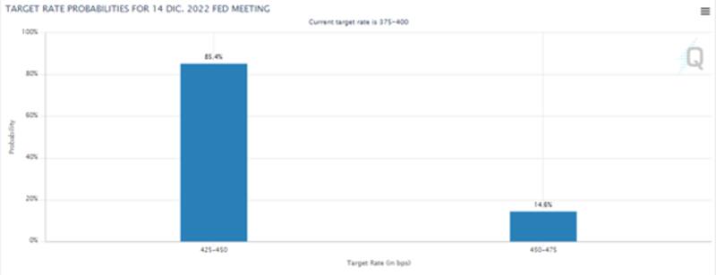 En este sentido, tras el dato de inflación el mercado de futuros de tasas de interés opera con la convicción plena de que la Fed subirá tasas 50pbs en diciembre, cuando en la previa todavía se veía 25% de probabilidad de una suba de 75pbs.