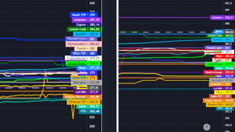 El nivel de las cotizaciones varía ampliamente en función del exchange. Un ejemplo de la variación es la brecha que existe entre el valor más barato, a $ 270,51 en Bitso, con la operatoria más cara de todas, a $326,15 en Huobi (P2P).