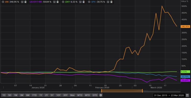 Esta dinámica es exactamente la opuesta que se dio a comienzo de año. Entre enero y finales de marzo el Vix había subido 346%, el S&P500 había colapsado 30% mientras que el dólar subía 6% desde comienzo de año.