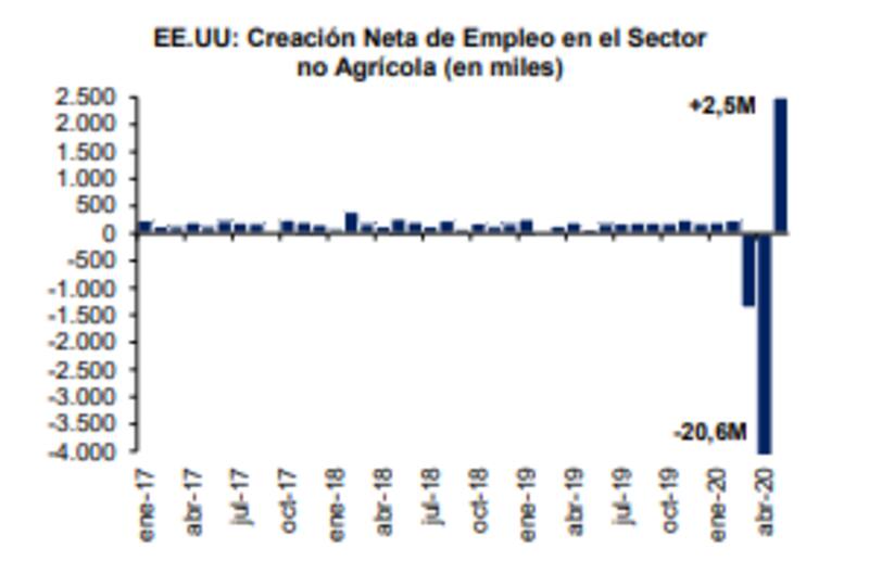 Fernando Marull, economista y director de FMyA explicó que si bien la primera cifra del dato de empleo aún se encuentra lejos de compensar las pérdidas registradas en abril (cuando se destruyeron más de 20 millones de empleos), y el desempleo continúa en niveles muy elevados, el reporte resultó una sorpresa grata considerando que el consenso de los analistas apuntaba hacia una reducción en las nóminas no agrícolas del orden de los 7,5 millones y un aumento de la tasa de desempleo hasta niveles cercanos al 19%.
