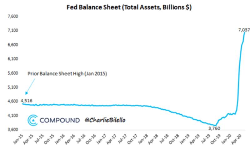Desde el inicio de la crisis, el balance de la Reserva Federalaumentó a u$s 7,100 millones. La Fed sumó u$s 2.900 millones tan solo en los últimos tres meses. Esta clase de medidas fueron llevadas a cabo durante 2008 cuando la hoja de balance de la Reserva Federal creció 151%. A comienzo de 2020 se encontraba en u$s 4166 millones por lo que si la Fed replicase dicho crecimiento porcentual, la misma se dispararía por encima de los u$s 10.000 millones.