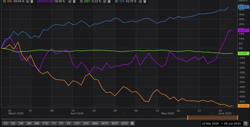 Desde el 23 de marzo hasta la actualidad la volatilidad (índice Vix) colapsó 59% y las acciones (S&P 500) subió 42%. Adicionalmente, los activos de cobertura como el dólar y el bono del Tesoro americano cayeron. El dólar Índex cae 5% desde finales de marzo mientras que la tasa subió 60 puntos básicos (19%), reflejando una caída en los bonos del tesoro ya que cuando sube la tasa cae el bono y viceversa.