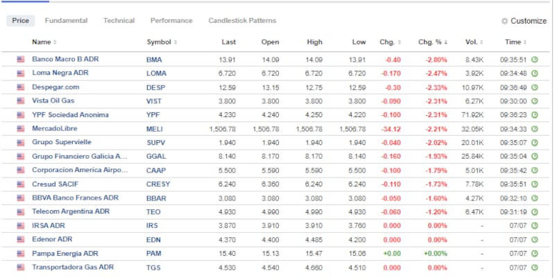 Los ADR abrieron con fuertes bajas. Las pérdidas eran lideradas por Banco Macro (-2,8%) seguido por Loma Negra (-2,4%) y Despegar (-2,3%). Vista Oil, YPF y MercadoLibre caían más de 2,3%. El sector financiero retrocede 2%, en promedio.
