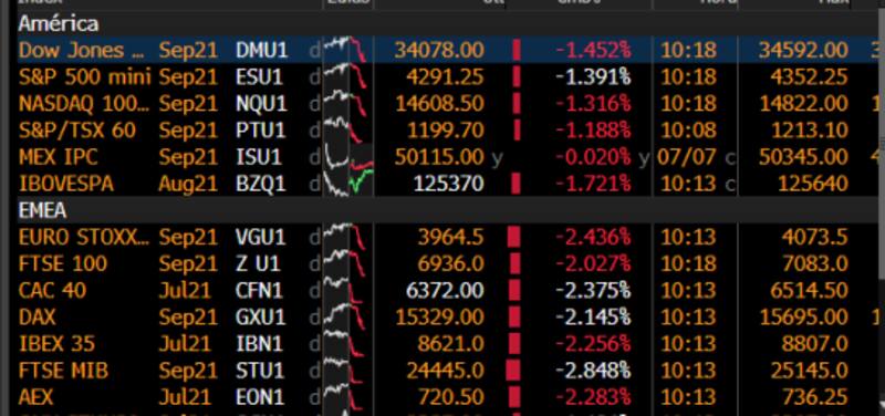 En Europa las acciones también operan con fuertes caídas, lideradas por el Stoxx600 que cae 2,43%. La bolsa de Italia y Francia son las que mas caen, perdiendo 2,8% y 2,4% respectivamente. España también pierde mas del 2,2% mientras que las bolsas de Alemania y Londres caen 2%.