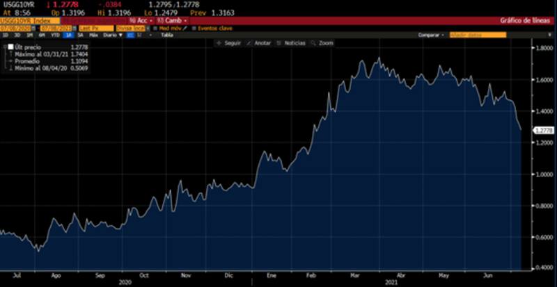 En momentos en donde las acciones caen con fuerza los inversores buscan protección en los bonos del tesoro americano. Esta estrategia es conocida como "Fly to quality" o salto a la calidad y, por lo tanto, ante la mayor demanda por cobertura, la tasa tiende a caer. De esta manera, la 10Y retrocede a niveles de 1,26%