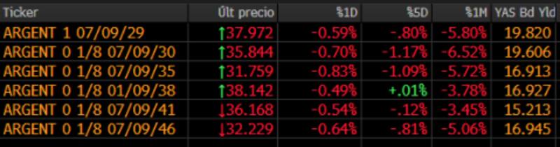 Todo el tramo de la curva de bonos opera a la baja. La parte mas corta cae 0,59% en el Global 20289 y 0,7% en el Global 2030. En la parte media, las caídas son de 0,83% para el Global 2035 y 0,5% para el Global 2038. Finalmente, en el extremo más largo las perdidas son del 0,6% en promedio
