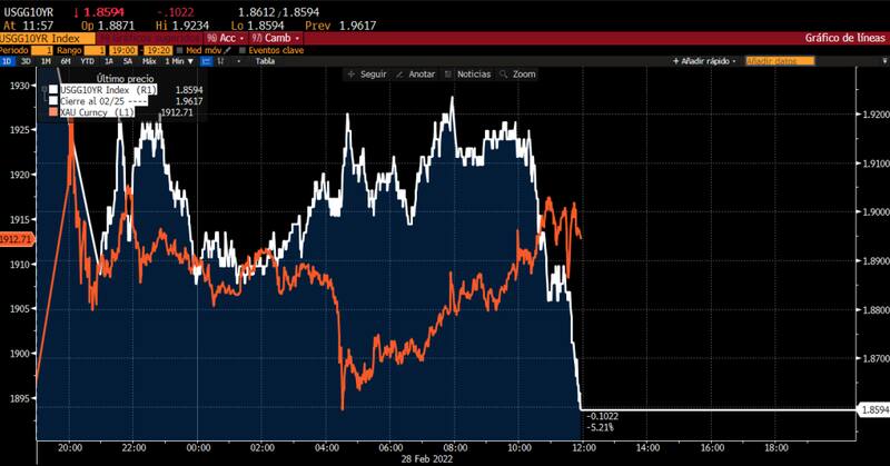 Se observa una suba del oro y una caida en los rendimientos de los bonos del tesoro americano, lo cual sugiere que los inversores saltan a activos seguros y desarman posiciones de activos de riesgo (acciones), aplicando la típica estrategia de fly to quality (salto a la calidad)