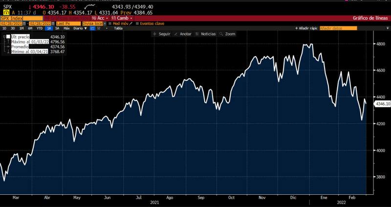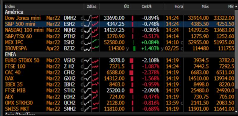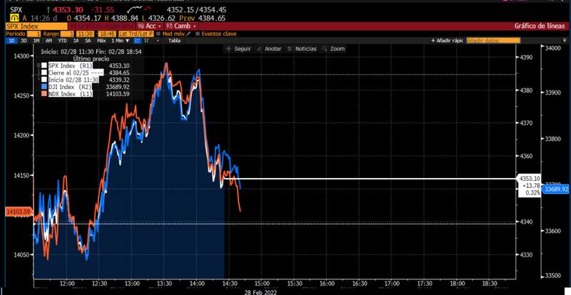 Las principales bolsas del mundo iniciaron la jornada a la baja como reacción a la intensificación de las tensiones y de la guerra entre Rusia y Ucrania. Tras la apertura bajista, las acciones rebotaron y pasada la mitad de jornada, la tendnecia bajita es reanudada.