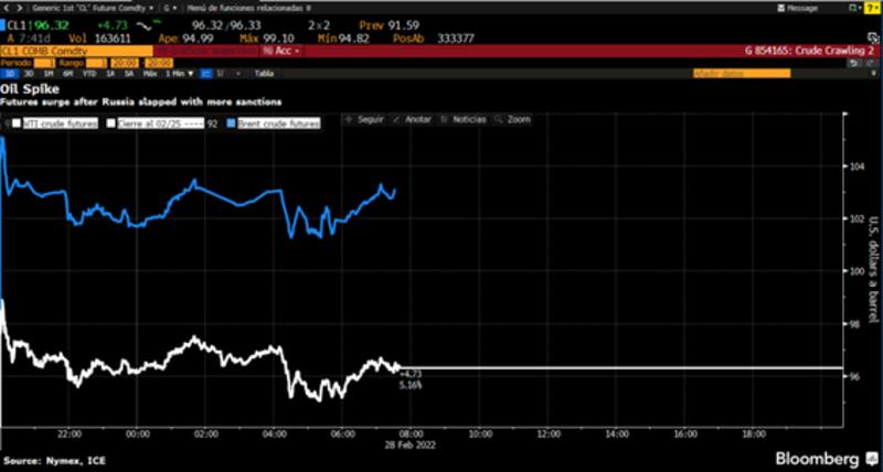 El petróleo crudo Brent saltó 2,75% % para volver a superar los u$s 100 el barril, y sube un 3,3% el WTI. Por su parte, el paladio saltó un 4% y el trigo de Chicago ganó cerca de un 5%, ya que los compradores intentaron evaluar cómo prescindir de los suministros de Rusia si las sanciones interrumpen el comercio.