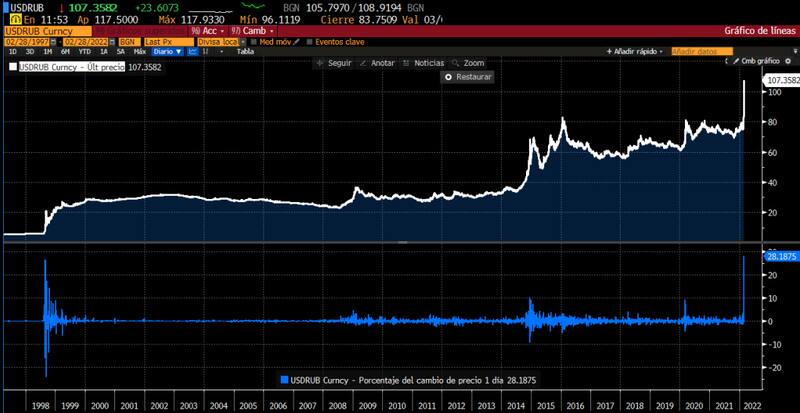 El rublo ruso se dispara un 28% al comienzo de la semana y salta a $107,3 rublos por dólar.