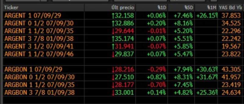 El Global 2029 sube 0,1%, mientras que el Global 2030 gana 0,5%. En el tramo medio, los bonos a 2035 operan sin cambios mientras que el 2038 pierde 0,1%.