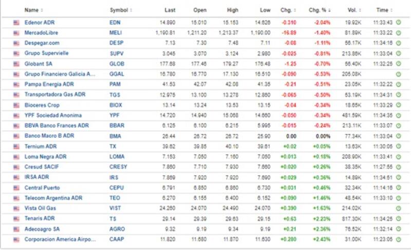 Las acciones operan en forma mixta. Mercado Libre y Despegar lideran las debilidades, con una caída del 3% y del 1,6%, respectivamente.