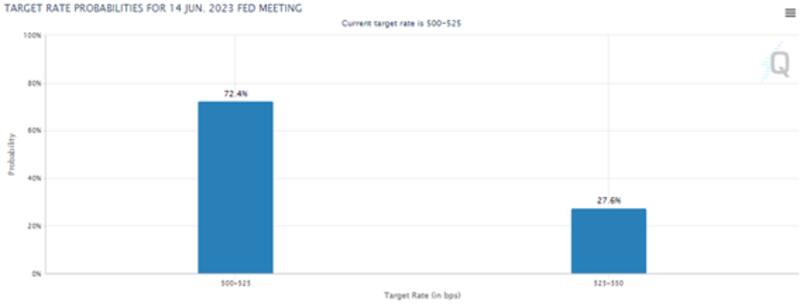 Las probabilidades implícitas de ver una suba de tasas el miércoles es de 27%, versus una probabilidad de 73% de que la Fed mantenga sin cambios la tasa en el rango actual de 5% al 5,25%.