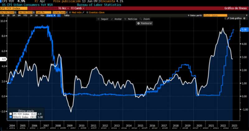 Por un lado, la inflación siguió apuntando a la baja, cayendo al 4,9%, aunque todavía por encima del 2% que tiene como meta la Reserva Federal.