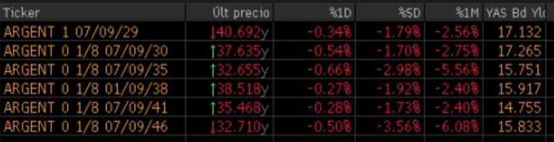 Yendo al plano de la renta fija, los bonos continúan castigados y sin piso. Todos los tramos de la curva finalizaron la jornada con signo negativo y acumularon esta semana bajas que oscilan entre 1,7% y 3,5%. En el último mes, en tanto, las debilidades son mayores, con descensos de hasta 6%.